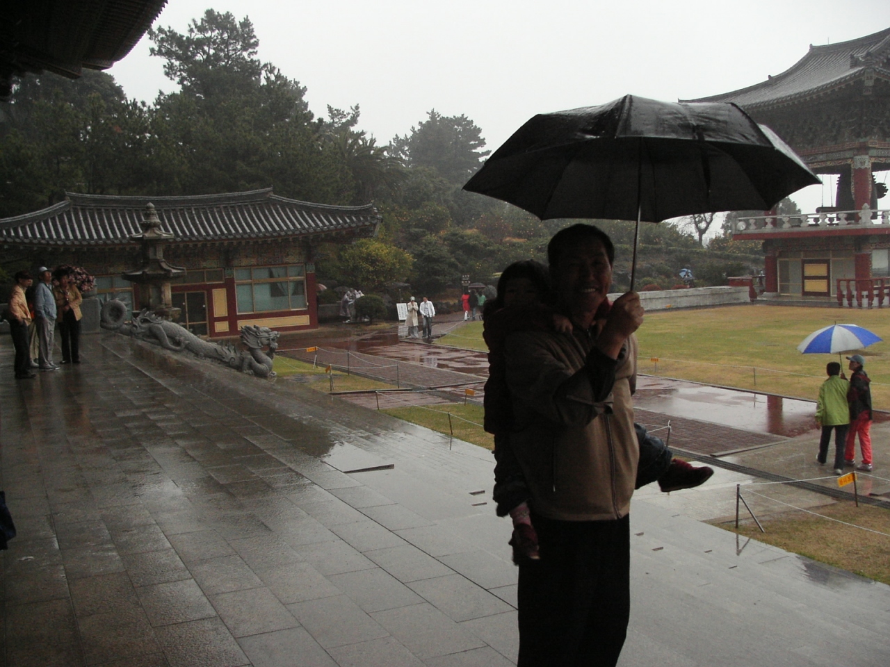 65歳と、決して若くはありませんが、雨の中傘をさしかけてくれたり、写真を撮ってくれたり、娘をおぶってくれたり(写真)、とても身軽で気の付く方でした。こちらの要望を何でも受け止めてくださり、妻が以前ソウルで買った朝鮮人参パック(化粧品)を売っている店を探してくれたり、夕食もホテルから歩いて行ける場所で黒豚カルビのおいしい店を紹介してくれました。