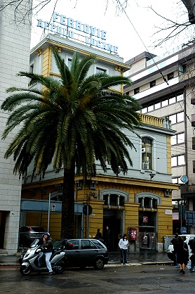 バーリからマテーラ方面へ行く私鉄FERROVIE APPULO-LUCANE線の電車は、バーリ中央駅を背にして立つと左手前方にあるこの黄色い駅の上階から出ます。下を通っただけでは駅とは気付きませんが、ちょっと離れて見るとてっぺんに駅の名前が画像のように見えます。