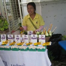 ワットチェディールアンの入口にて、献花とロウソクとお線香を買う(30B)。