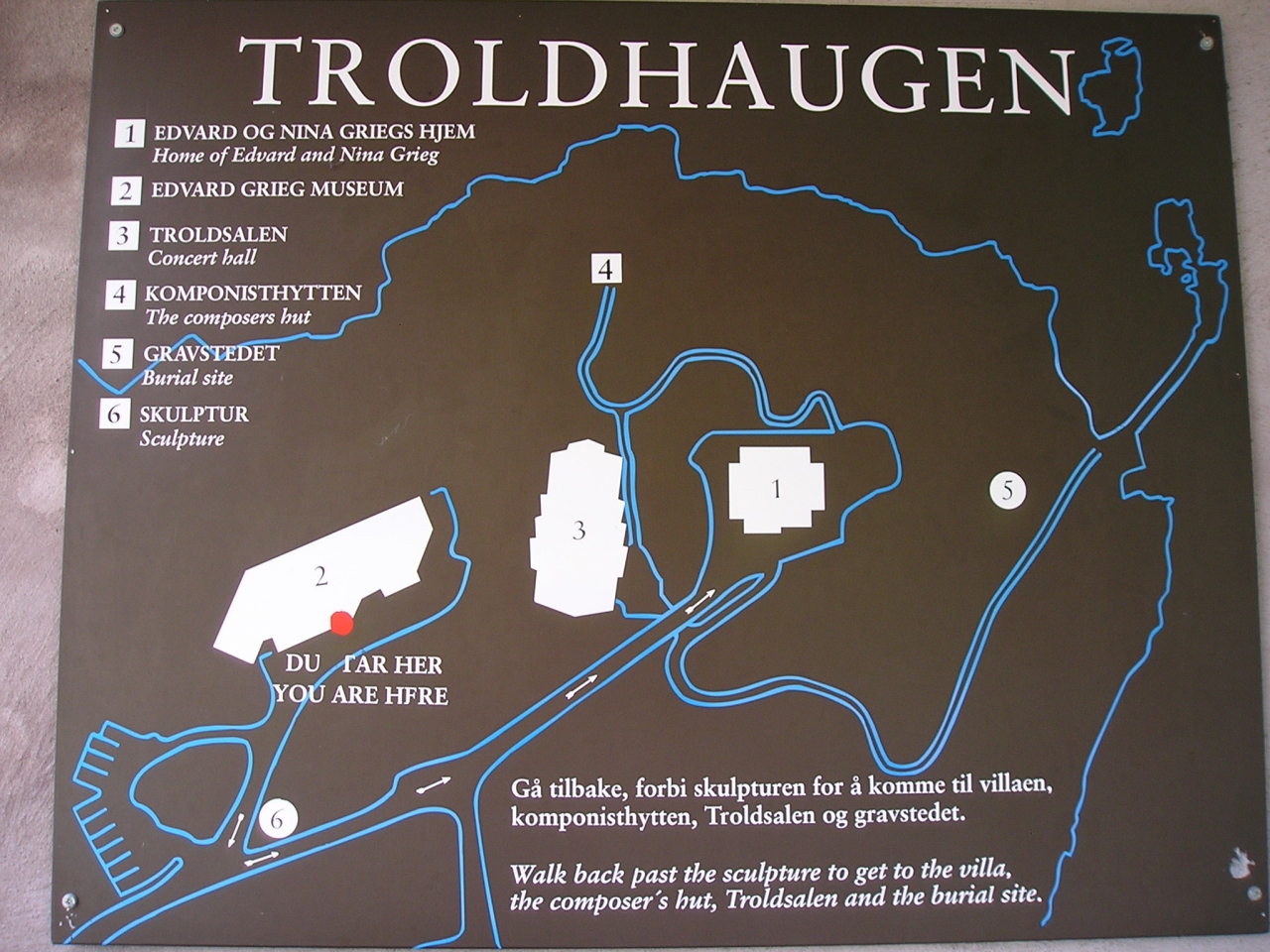 ベルゲン市内を走っているバスの20、23、24、100番で(あるガイドブックには19、20、21番とありますが)15分ほどでトロルハウゲンのバス停に着きます。ベルゲンカード利用OKです。乗るときにドライバーさんに、グリーグの家に行くことを伝えておいたので、バス停につく少し前、ここから入っていく道だという所を教えてくれました。帰りのバス停もすぐ近くにあります。