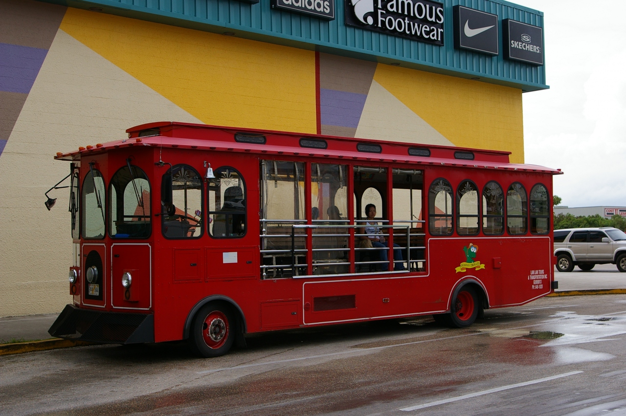 グアムのホテル街やショッピングセンターで一番目立つバスと言えば、この赤いトロリーバスでしょう。