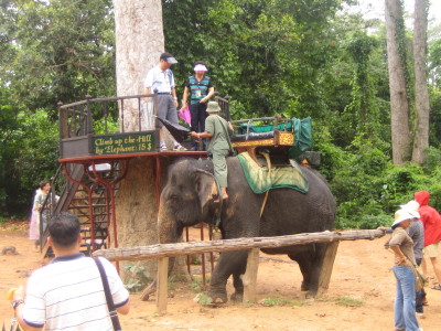 多くの観光客が西バライに沈む夕日を見に行くプノンバケン山へは、象に乗って登ることもできます。