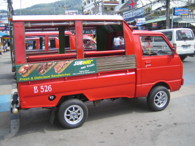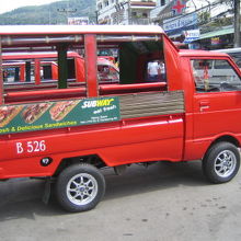 プーケツトのトゥクトゥクは、バンコクのような三輪ではなく写真のような軽四輪タイプです。