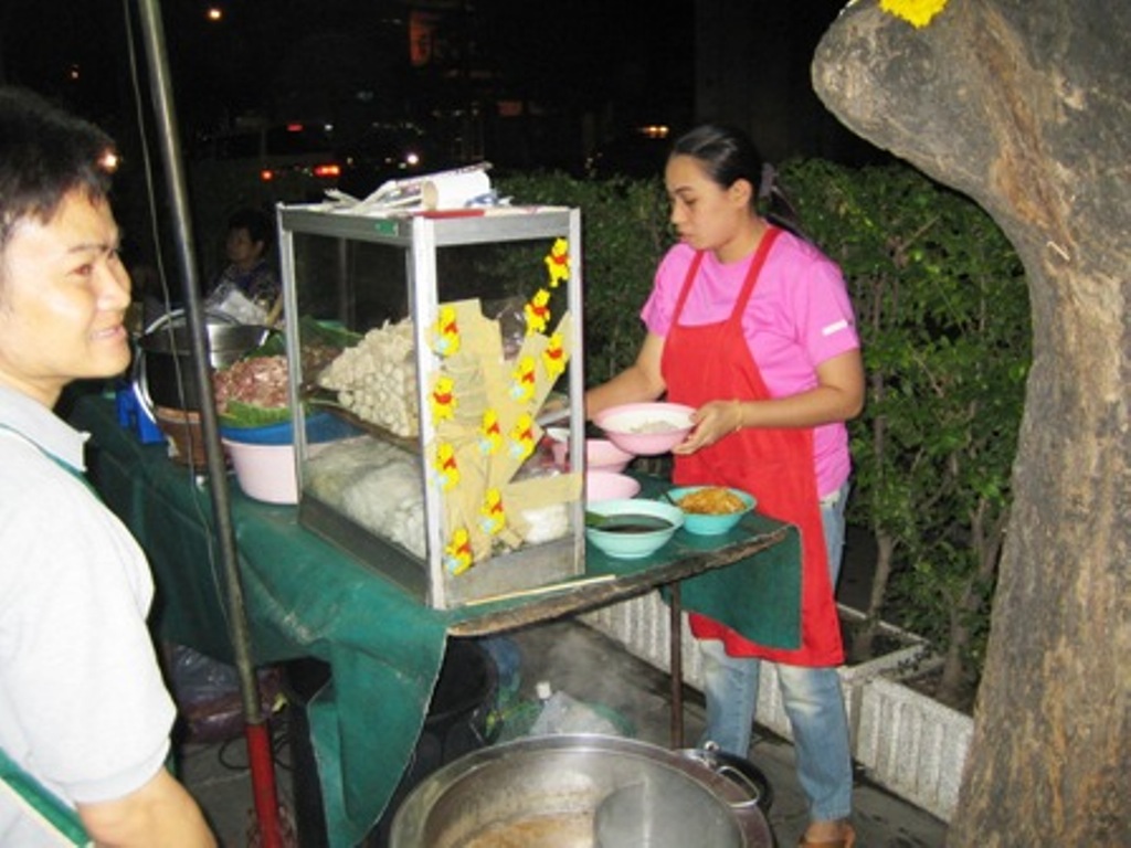 スクンビツト通り奇数側の道、アンバサダ−ホテル前の工事現場を通り過ぎた辺りの麺屋台前のテ−ブル席に座った。