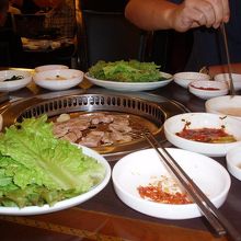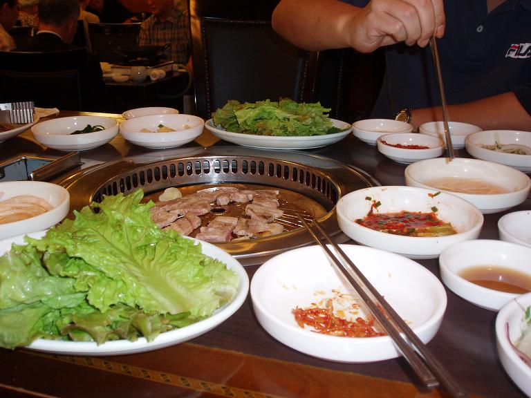 韓国に来たからにはどうしてもはずせないのが焼肉。といっても日本のそれとは違い、韓国ではサンチェなどの野菜に乗せて、コチュジャンなどで味を付け、ニンニクなどの薬味と一緒に包んで食べる。韓国でも牛肉は高価なため、地元の人には豚肉が人気だとか。ロース、チャドルベギ、カルビサムの牛肉盛り合わせ小、デジカルビ(豚カルビ)、サムギョッサル(豚三枚肉)を注文。店員さんが付きっきりで肉を焼いてくれる(まだ入りたてらしく女将さんに指導を受けていた)。ロースはジューシーで肉を食っていると実感できる味であり、デジカルビは一番ご飯に合う。玉葱のサラダ、白菜キムチ、オイキムチ、大根の水キムチ、ホウレン草のナムル、スルメ、ヤンニョムケジャンなどバンチャン(おかず)がこれでもかと並び、何度もサンチェを追加しに来てくれた。最初はビールだったが、地元人にならって焼酎を飲み、10%割引のクーポンを使ってW58,000也。韓国焼肉の王道が味わえて大満足であった。(評価★★★★★)