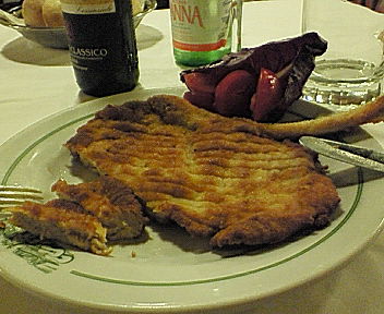 Cotoletta alla Milanese(ミラノ風カツ)16ユーロ、赤ワイン(キャンティ・クラシコ1/2)8ユーロ、