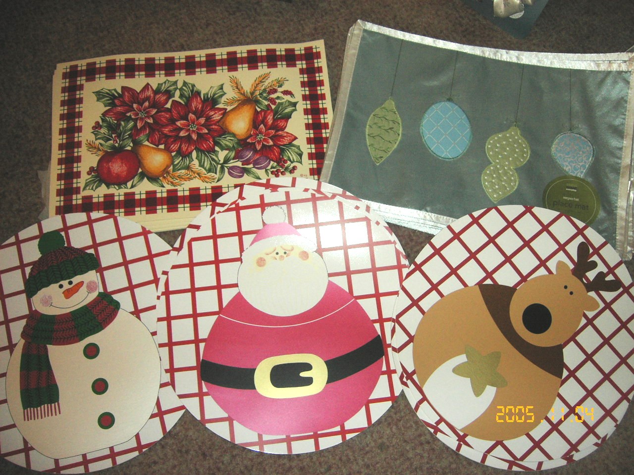 我が家用に珍しいブルーオーナメント柄$3.99。その他お土産に購入したのが○のランチョンマット(サンタ・トナカイ・スノーマン)$0.99、□のお花柄も$0.99!激安です!!