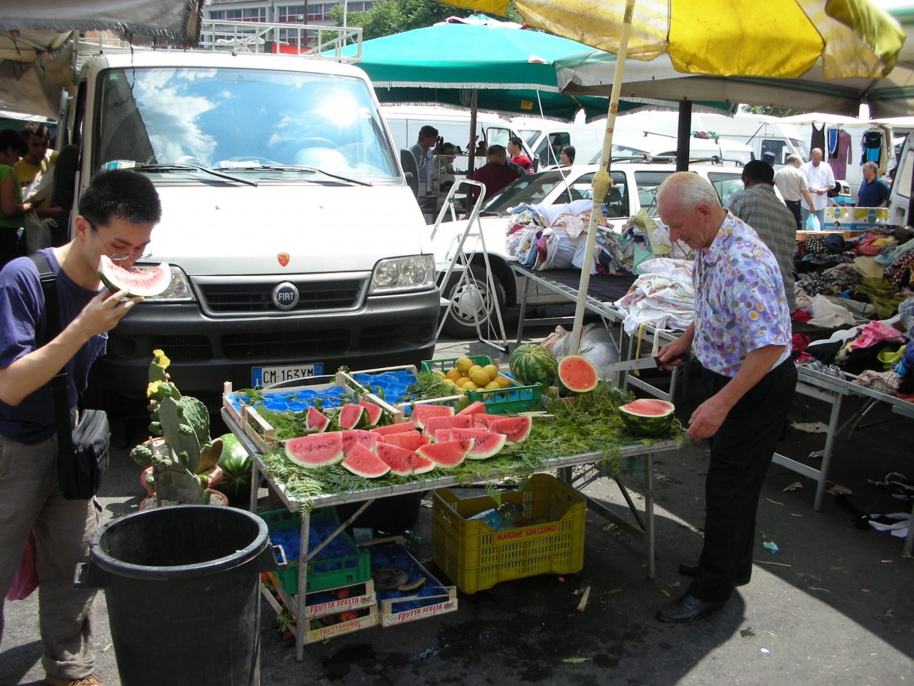 トラステヴェレでは、日曜に大きな市がたつのですが、その中に1件だけスイカを売っているお店があります。