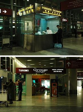 小さい到着ロビーに出ると、目の前に両替のブース(上の画像)、左手に観光インフォ(下の画像)があります。この観光インフォで地図や無料パンフをもらっていくといいですよ。地図は買い物用、観光用など数種。資料は英語や中国語版が多いですが、日本語が併記された地図もありました。安宿紹介パンフもあり。