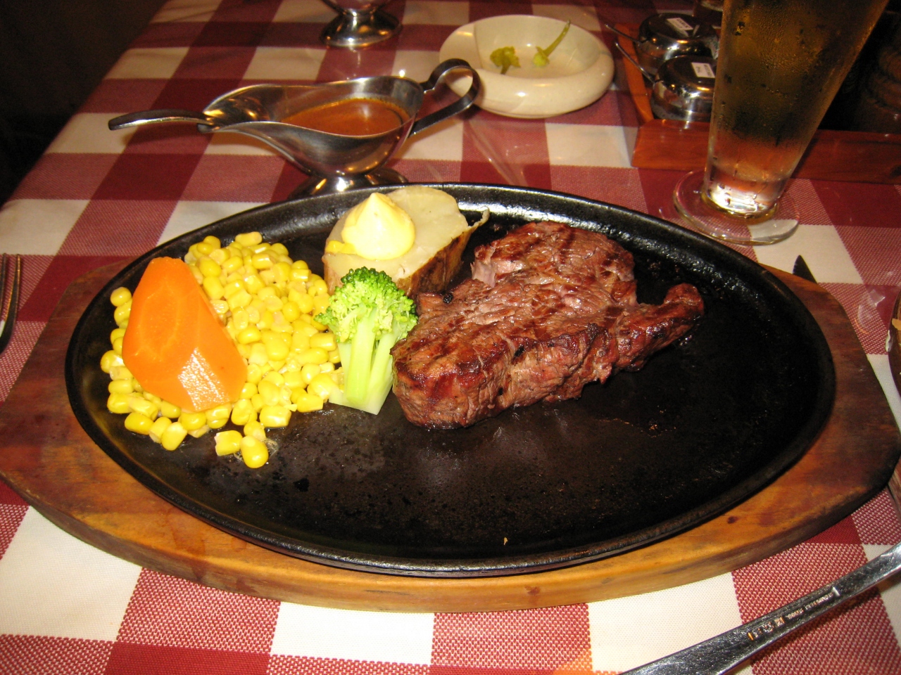 私たち夫婦はフィレステーキ170g、ハンバーグステーキ、サラダバー&パンは2人前、ビール2本で60$位でした。それ程高いと言うことは無かったです。ステーキはミディアムにしてもらい、入り口の近くで客にも焼いているところが見えました。最低が170g、で5段階くらいの重さで注文できたと思います。近くの席に座ったがっちり系のおじさんは220gを頼んでいました。このステーキは焼き上がって出されると、テーブルに運ばれた後、赤ワインをかけて食べます。ソースはデミグラソ−スでした。