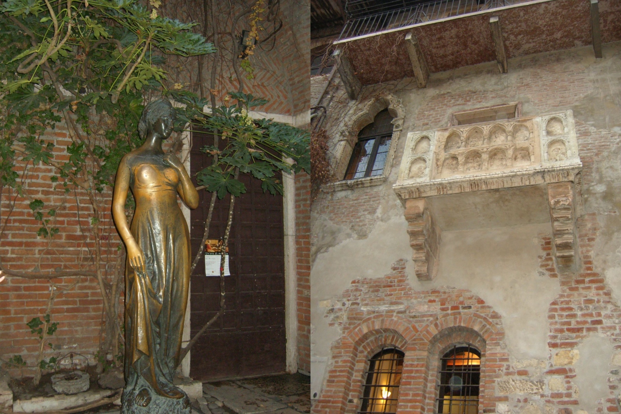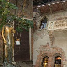 本当かどうか分かりませんが、「ジュリエットの家」と呼ばれている場所。狭い路地から入ると、小さな中庭に。正面にはジュリエット像が、右上にはバルコニーがあります。ジュリエットの胸を触ると幸せになるとか、恋人が結ばれるとか…。