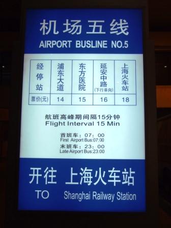 上海火車駅(鉄道)と浦東方向にはこのバスですね。最高時15分間隔と書かれていますが、本数は比較的多いですね。7;00から23:00まで発車します。窓口があるけど、料金は車内で払います。終点の上海火車駅が18元。途中の浦東大道 14元、東方医院 15元、延安中路(駅方向だけ停車)16元です。