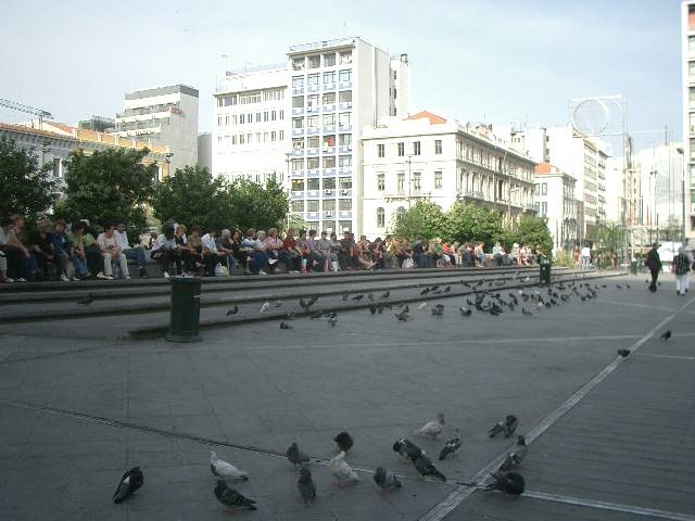 オモニア広場もこじんまりとした広場です。鳩の多いのが特徴ですが、長大なベンチがひとつあり、そこに人が横一列になって座っています。面白い光景です。いかにも、のんびりとした、ギリシャ人の国民性をかんじます。