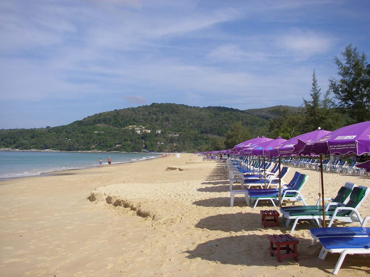 2004年12月の地震・津波被害による復興で、ビーチは、紫のビーチパラソルで統一されて、白い砂浜に透き通る海がとってもキレイです。