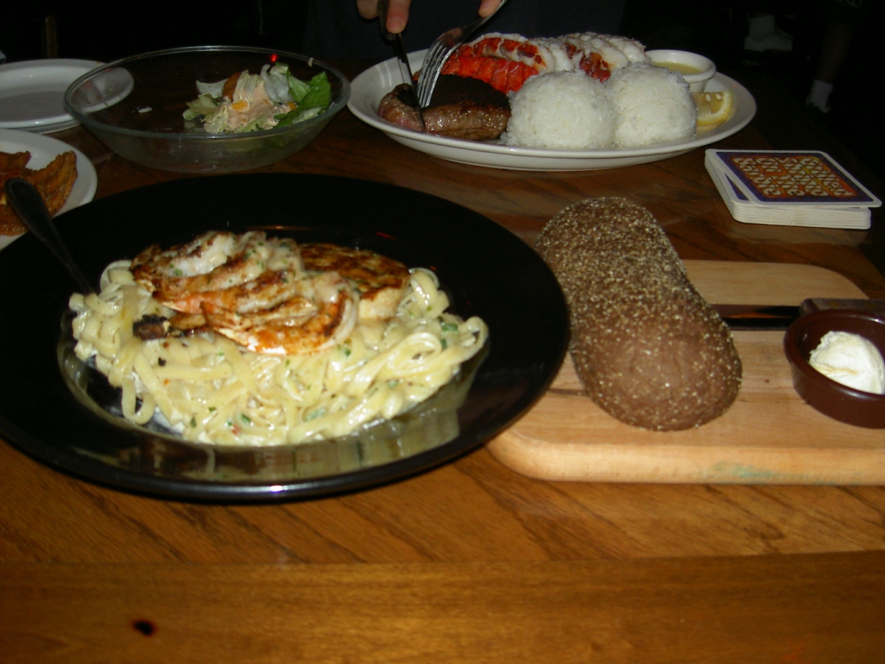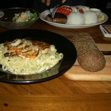 ようやく案内され、主人はロブスター&ステーキのメニューを私は画像のようにエビのパスタを頼みました。パンもついてくるとは知らず、すごい量だったので結局お持ち帰りパックにしてもらいました。主人が頼んだステーキとロブスターはとってもおいしかったです。