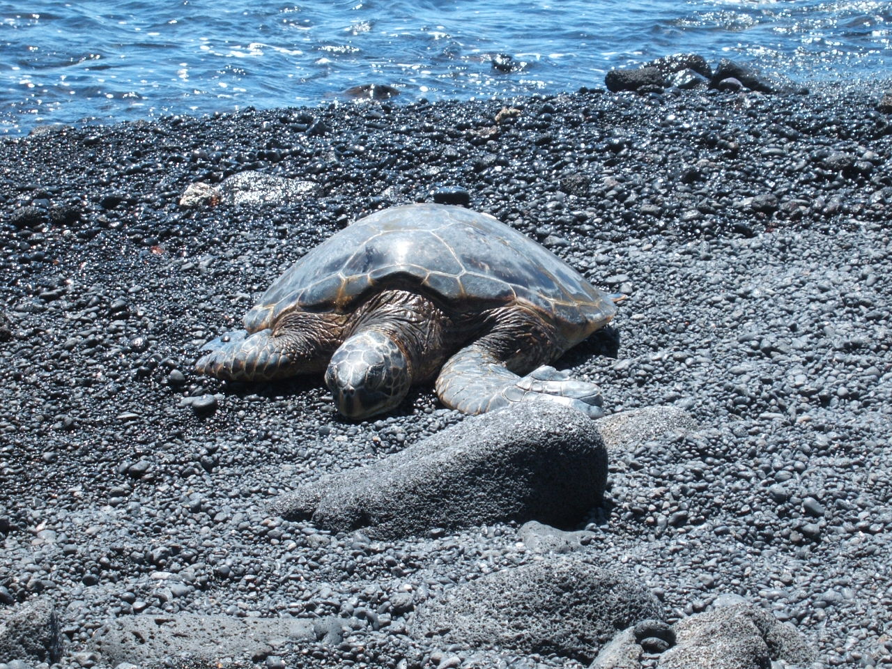 「ウミガメが休憩にやってくる」と書いてあったので、火山にいくついでに寄って見たら、本当にウミガメが昼寝してました。