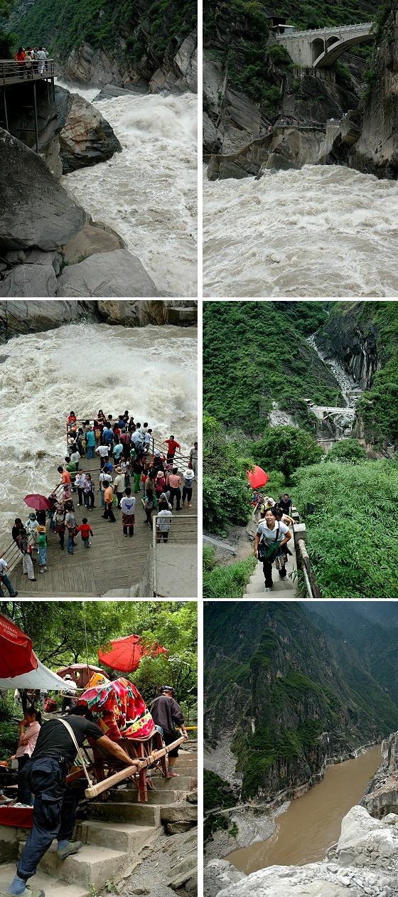 画像2段目左は迪慶チベット族自治州側から虎跳峡に突き出した展望台。流れ下る渓流が間近に見えて大迫力。ここの先端部分は一度に15人しか入れないと言うことなのでご注意を。