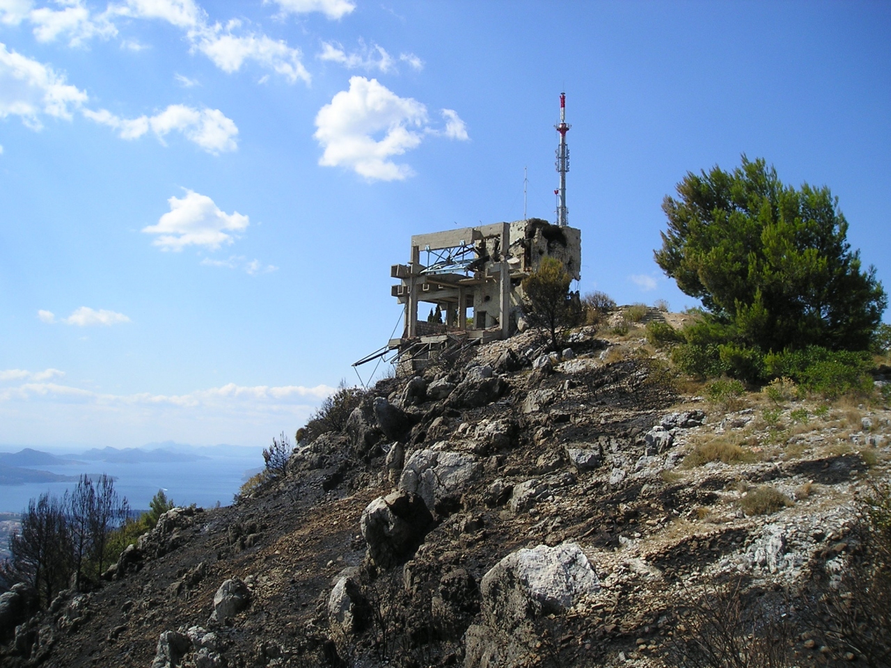 内戦時に破壊されたロープウェイの頂上駅が残っていて、白い大きな十字架が建っています。