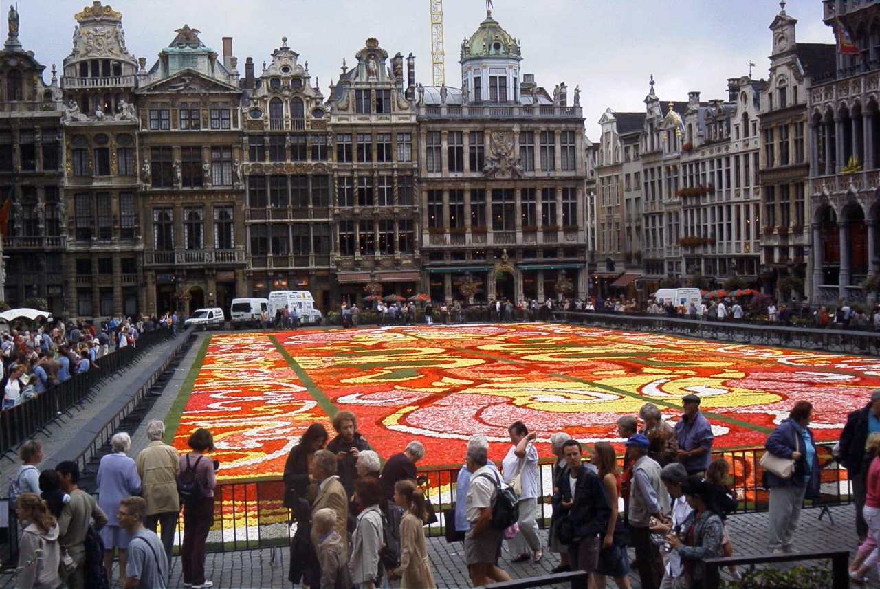 グランプラスの中央にさまざまな色の花がしかれ、いろいろな模様を作ります。