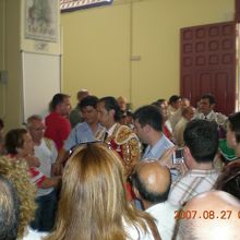 入場してから右方向に行き、廊下を回っていると、人垣ができている。見ると裏口のようなところ・・もしや、と思い数分間待つ・・やっぱり! 闘牛士が入ってきた!写真をとるのがせいいっぱいだったが、間近で見れてよかった!開始時間の20分ぐらい前です。