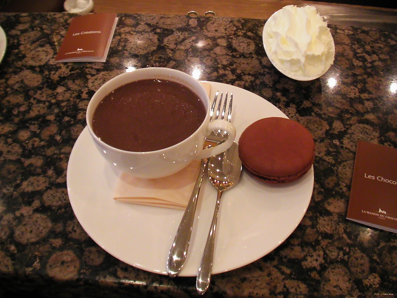 メゾンドショコラの店舗にはショコラが飲めるところがあります。かなり濃厚な味で、これぞショコラ!!という感じでした。ビターとスイートの2種類ありお値段は7ユーロ弱、これにマカロンやレモンケーキをつけると9ユーロ。
