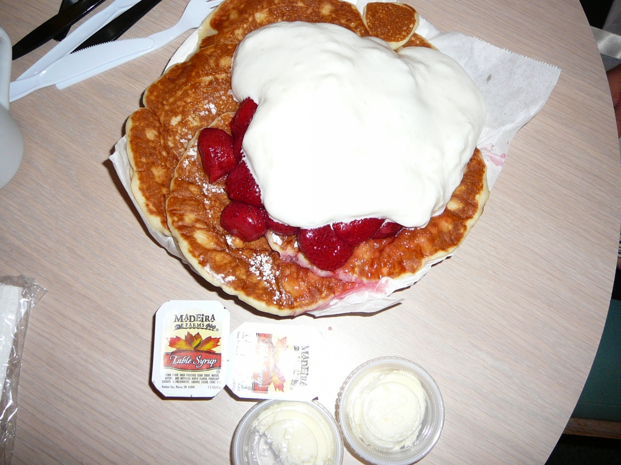 ストロベリーホイップナッツのパンケーキをテイクアウトしました。店員のおばちゃんは早口の英語で説明しますが、メープルシロップを多めにつけてくれたり、ホイップが溶けないように、別の容器に分けて持たせてくれたりと、とても親切でした。