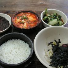スンドゥブを頼むと石焼ご飯とボウルに入ったナムル、キムチが出てきます。