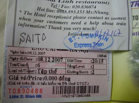 サパにトレッキングに行くためハノイ駅からラオカイ駅まで特急夜行列車に乗りました。