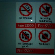 駅の中には写真の様な看板があります。喫煙で$1000罰金。飲食で$500罰金。燃えそうなモン持ち込んだら$5000罰金。ドリアンは持ち込んだらダメだけど罰金はナシ。