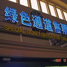 青いネオンサインで「緑色通道售票処」(「緑」と「処」は中国の文字が表示できず代用しています)
