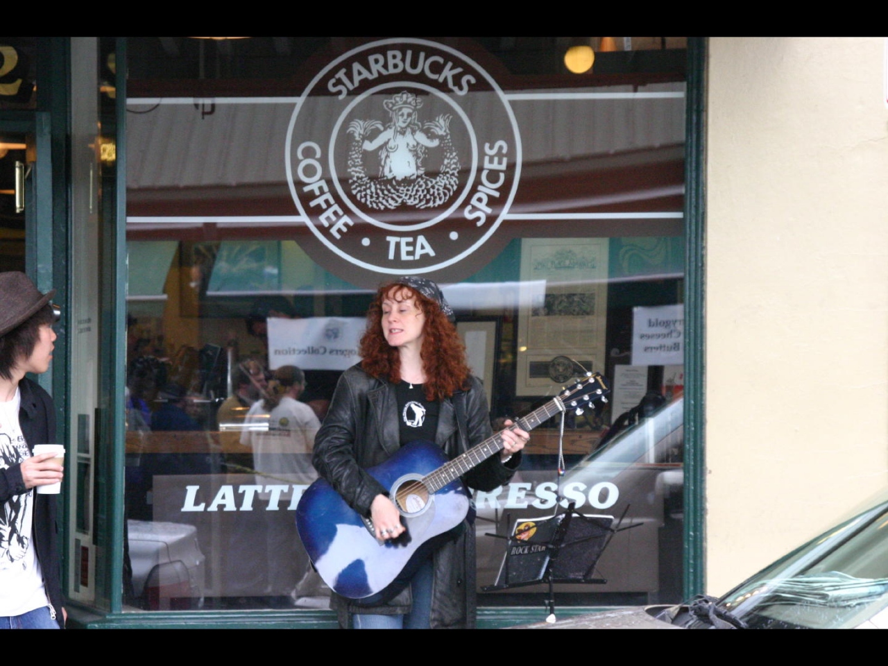 パイク・プレイス・マーケットの地上階、市場とは逆サイドの丁度真ん中程にスターバックス一号店はあります。ここのお店は注文すると名前を聞かれるのですよねー注文のコーヒーが出来上がると名前で呼んでくれます。出来上がったコーヒーのカップには汚いローマ字で自分の名前が書かれます。お店の入り口ではアマチュアのミュージシャンが入れ替わり立ち代りやってきて歌を披露とても楽しいお店です。ハワイじゃないけれど日本語OKです。(たまに日本語が出来るスタッフが居ない事もありますが・・・)見ているとほとんどの日本人がマグカップを買っていっています。