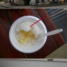 一番のお勧めは、カスタードプリンのはいったシェーブアイス「カスタード・ボール」(4ドル)。プリンの味が甘すぎず、ふわふわの氷とココナッツミルクのシロップが、その味を引き立てます。