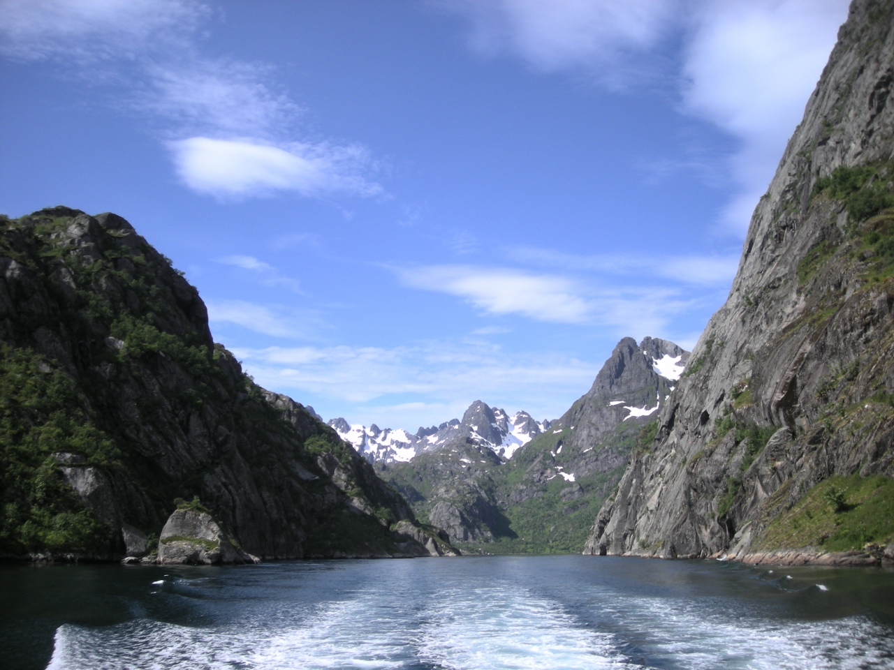 スヴォルバーからトロルフィヨルドまでは、片道20km以上あり、その間の7割程度は海峡を進んで行きます。海峡の両側には山脈が続きますが、フィヨルドを思わせるほどの険しさではありません。むしろアルプスの山頂を思わせるような峰々が近くに感じられます(特に西側)。