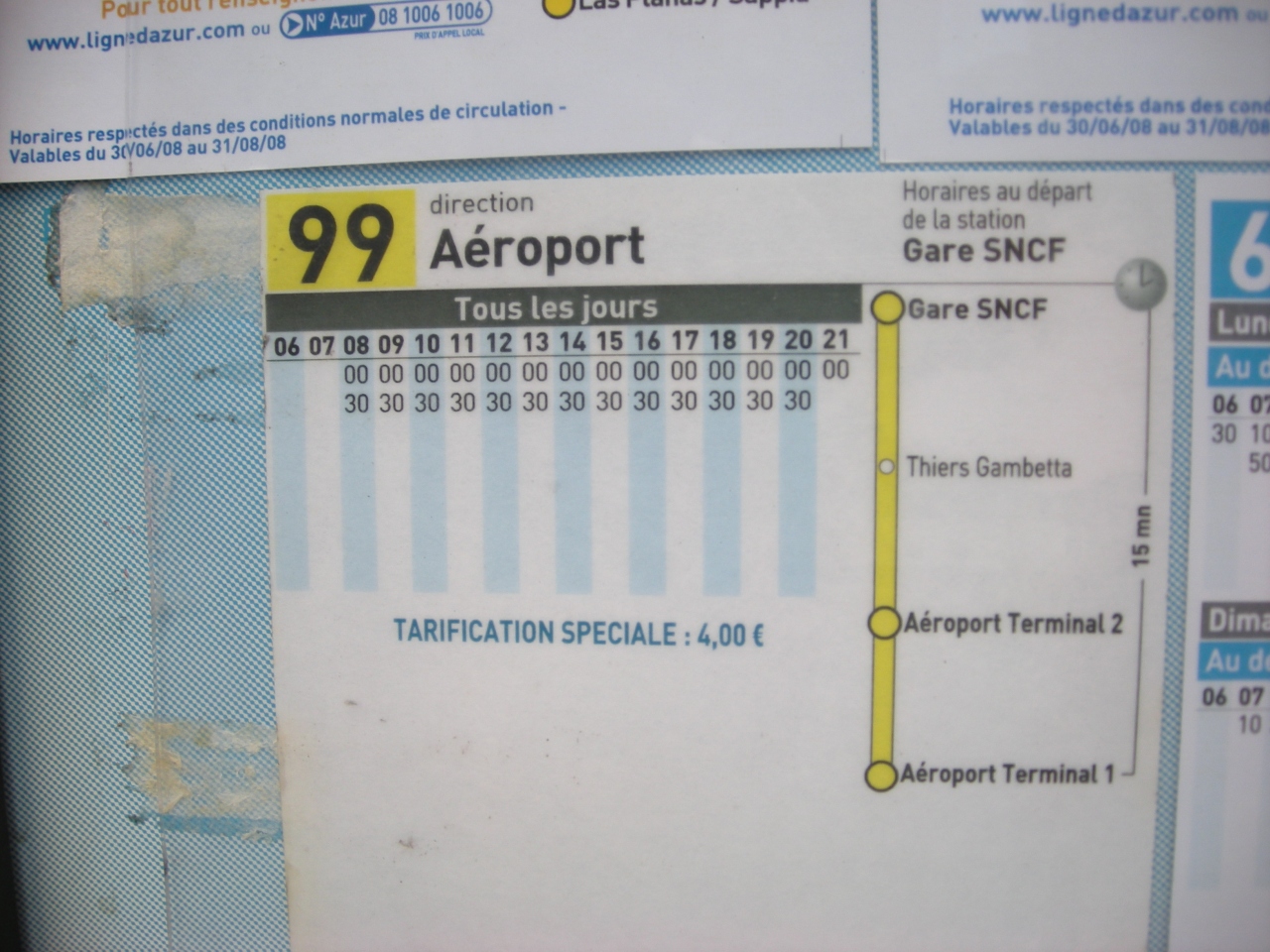 98番は空港 - マセナ広場 - Gare Routiere間を往復しているようです。(リクエストするとNice Ville駅に停まってくれました。でも、便によるようで、時刻表にその旨明記されていました。"Gare SNCF upon request"だったかな?)