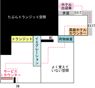 いろんな情報を見ても、うっかりサービスカウンターを見つけられずにスルーしてしまうところだったので、正確ではないのですが…記憶を頼りに地図を描きました。(もっと正しい情報が得られればまた修正しようと思っています。情報お持ちの方、お手数ですが私の下記ブログにご連絡ください。)