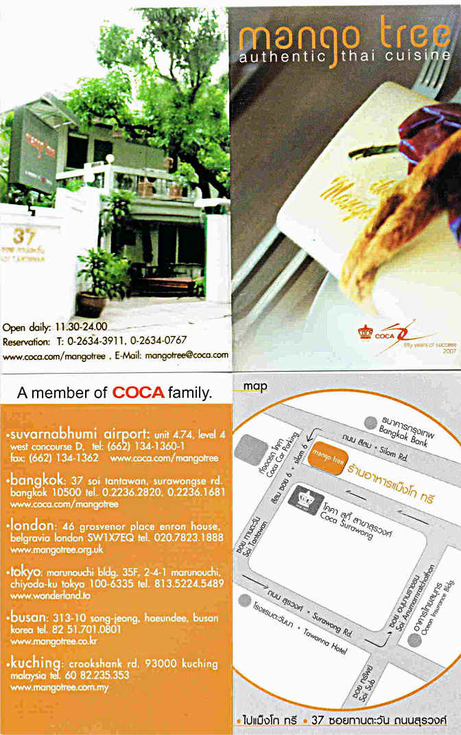 タイスキで有名なCOCAグループのタイ料理レストランです。店構えは洒落た一軒家風で落ち着いた佇まいを見せています。日本にも支店があり(東京-丸の内ビル35階)人気を博しています。同じ料理がバンコクでは安価で食べられるのが嬉しいです。当然、物価が違うので当たり前ですが・・・?コース料理は600バーツです。味は日本人の口に合うようにマイルドに調理してあり、とても美味しいです。この店の向いにはグループのCOCAスリウォン店がありマンゴーツリーよりも安価です。