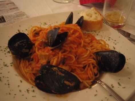 シーフードスパゲティはやや茹ですぎだったものの、海の幸のうまみたっぷりのトマトソースがとてもおいしく、貝や海老やいかなどが入ってなかなか豪華だった。大満足。