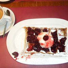 温かいワッフルと 冷たいアイスクリーム、果肉たっぷりのチェリーソース