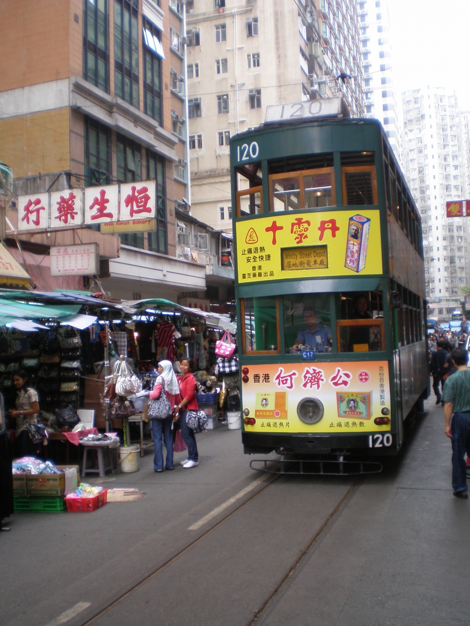 行き方です。中環、銅羅湾あたりで、「往北角」と書かれたトラムに乗って終点です。2階席最前列から、こんな狭い商店街に電車が入っていっていいの!!という信じがたい風景を堪能してください。きっと香港の強烈な印象となって思い出に残りますよ。