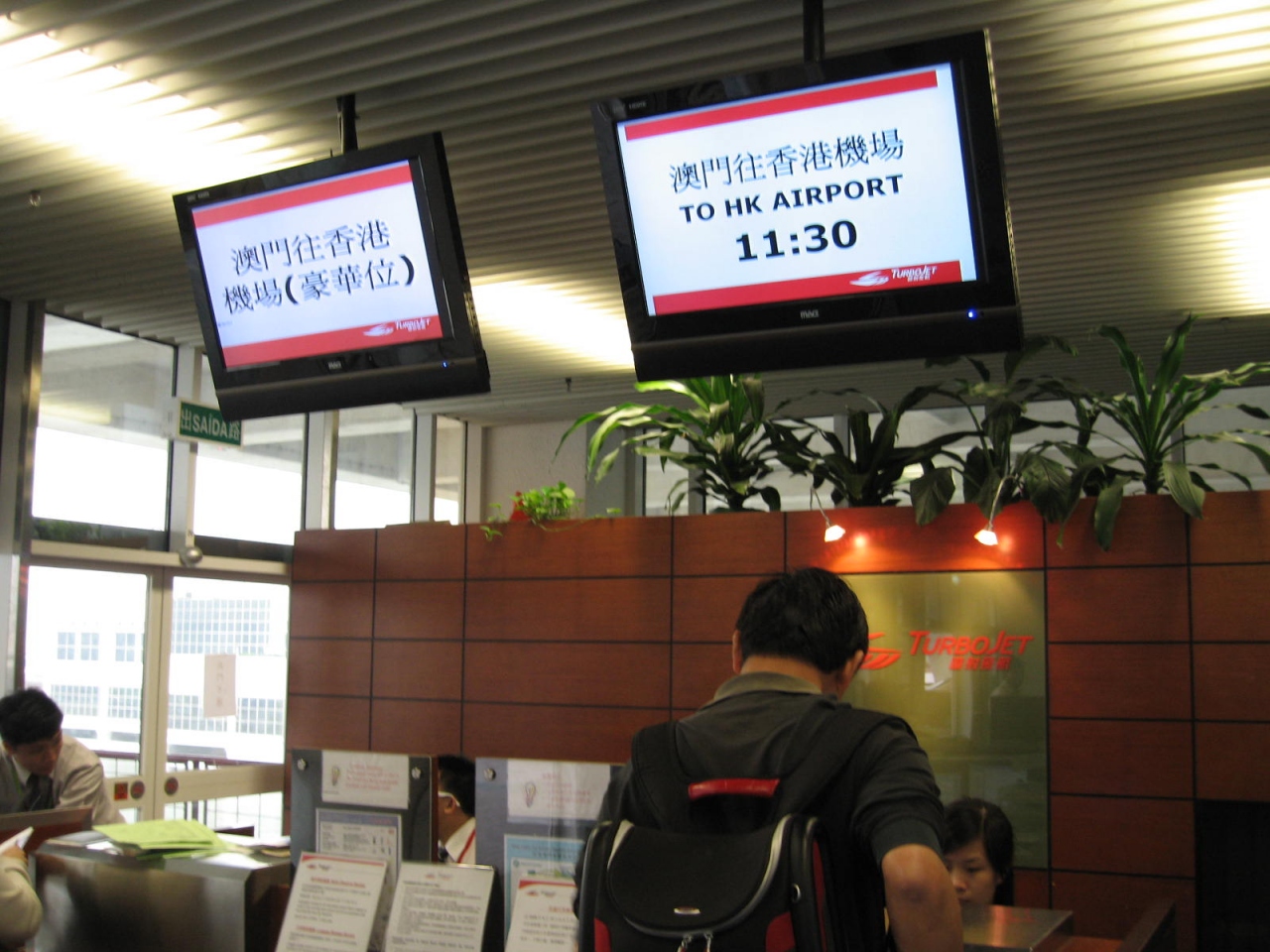 国際線乗り継ぎ客は白いモニター表示のカウンター