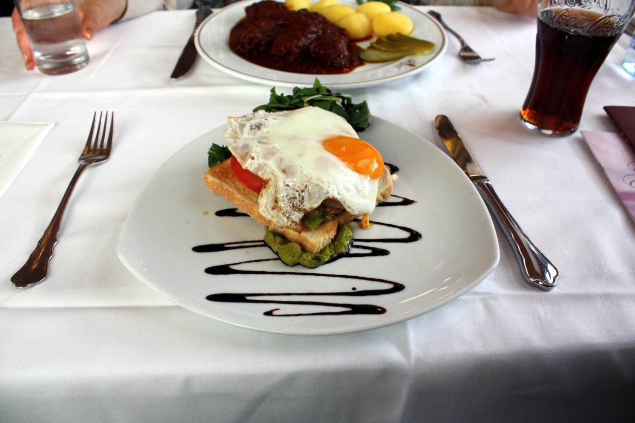 頼んだのはステーキサンドウイッチ(14ユーロ),グラーシュ(14ユーロ),食後のモーツアルトトルテ(4.4ユーロ)です。