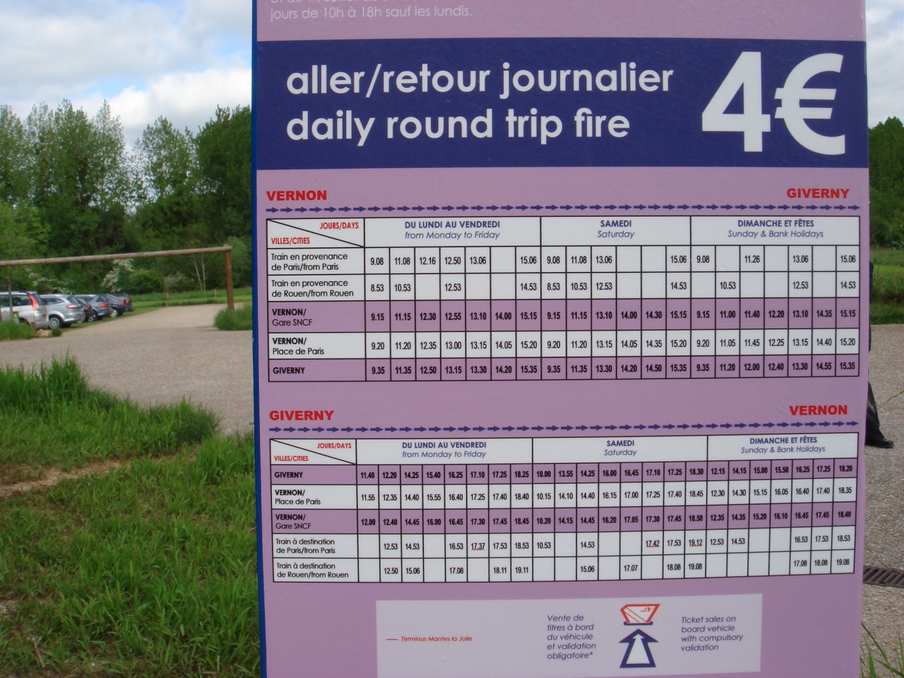 モネの庭、ジヴェルニーの行き帰りバス時刻表です(2009年5月撮影)。