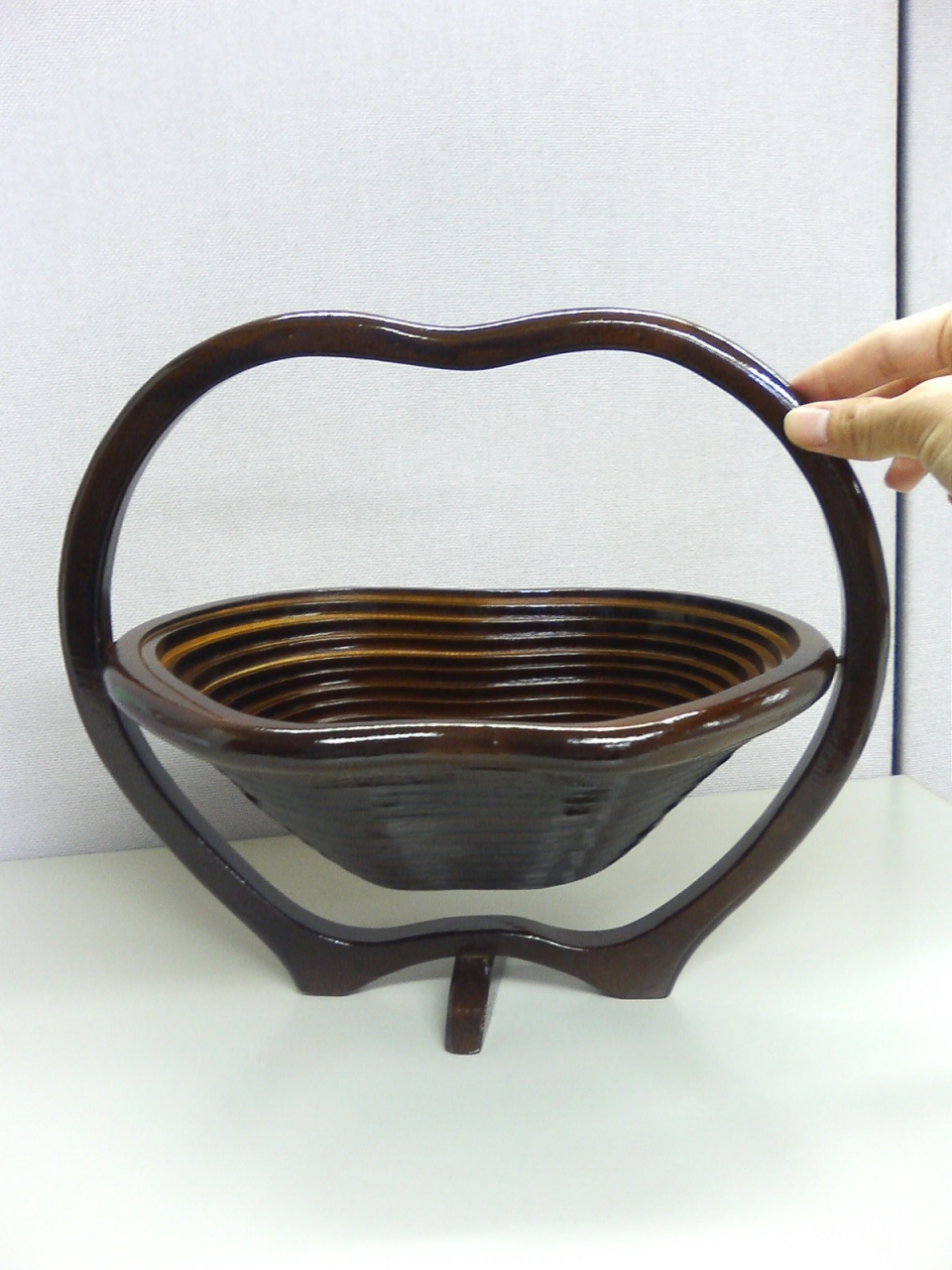 ?で投稿した木工芸品の組立後の写真です。外枠をつまんで立てれば一瞬で完成。かごの部分はゆらゆら動きます。