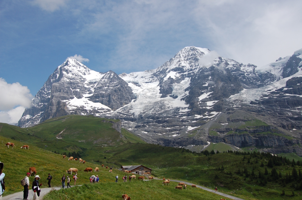 少しアップダウンもありますがアイガー、メンヒ、ユングフラウを左手に見ながら、お花畑の中を歩きます。アイガーをまた違った角度から見られることがうれしかったです。途中に雷の音がして雨が振りましたがすぐやんで晴れました。覚えきれないほどの数々の花に感動し、山に感動し、いい体験になりました。