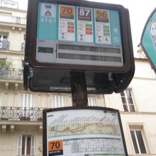 写真はバス停。バス停には、番号とその路線のバス停の地図(これはとてもわかりやすいです。)、時間帯によって何分おきにくるのかがわかります。