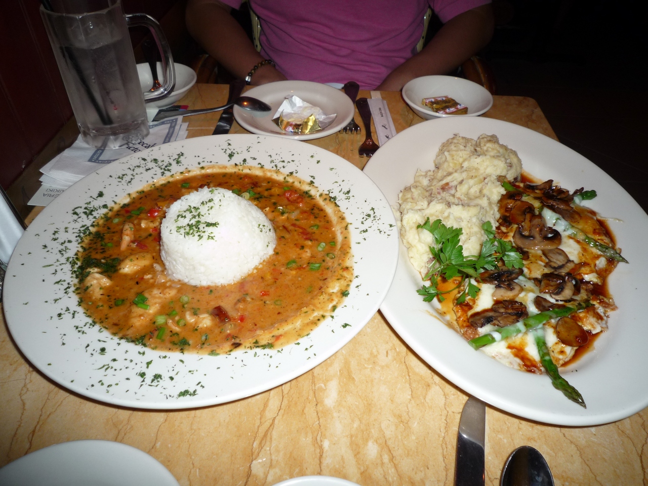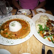 画像、左:海老とチキンのガンボ(?)