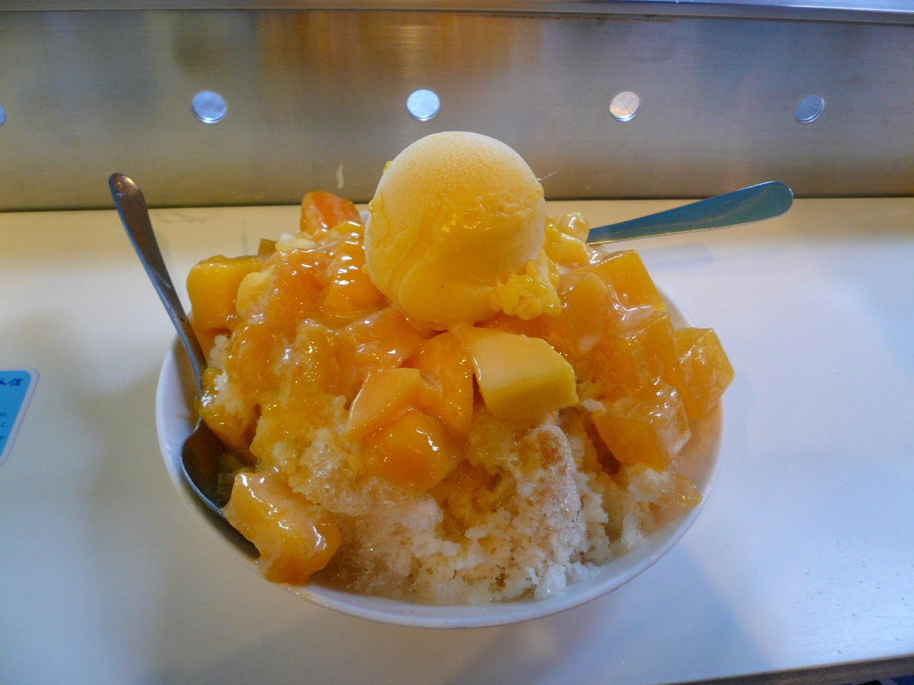 カキ氷にマンゴーアイス+マンゴーゼリー+フレッシュマンゴー、そしてミルク掛け!160元!