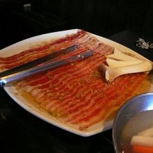 一緒に運ばれるタレとネギを野菜で巻いて頂きます。