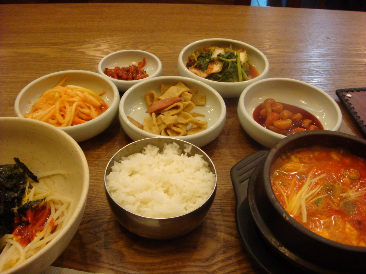 まず最初に、もやしナムルと海苔とコチュジャンが入ったどんぶりが出てきます。このどんぶりに、スンドゥブやご飯を入れて混ぜて食べます。ここは三店舗あるみたいで、私は一号店を利用しました。武橋洞に二店舗と明洞に一店舗あるみたいです。安いですし、とても美味しいスンドゥブなので是非食べてみて下さい。