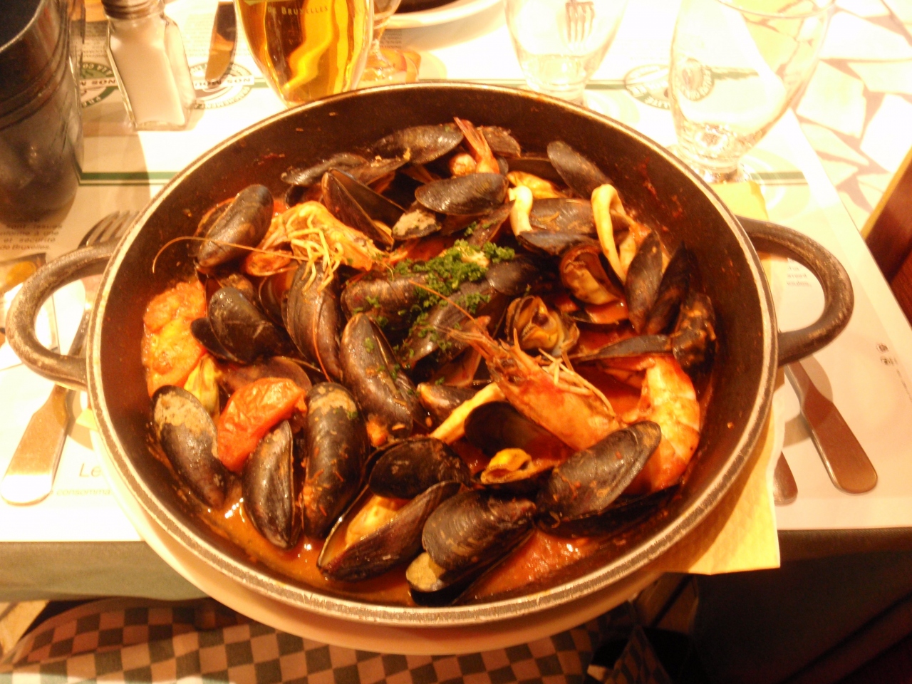 写真は、エビ、イカの入ったトマトソース味のシーフードムール貝。